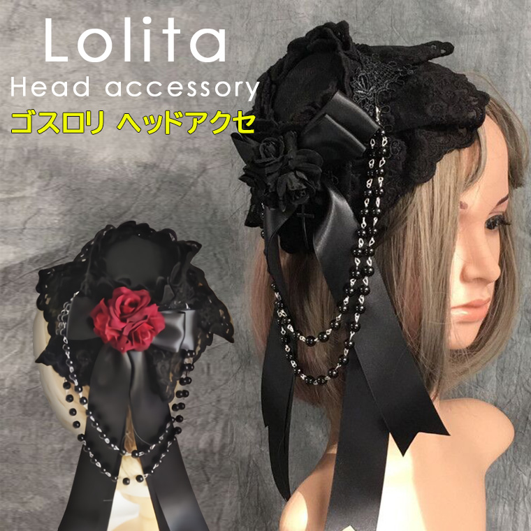 ロリータファッション&ゴスロリにぴったりのヘアアクセサリー ヘアアクセサリー ミニハット 黒 髪飾り レースハット バラ クロス リボン チェーン クリップ留め ヘアアクセ ヘッドアクセ 全2色