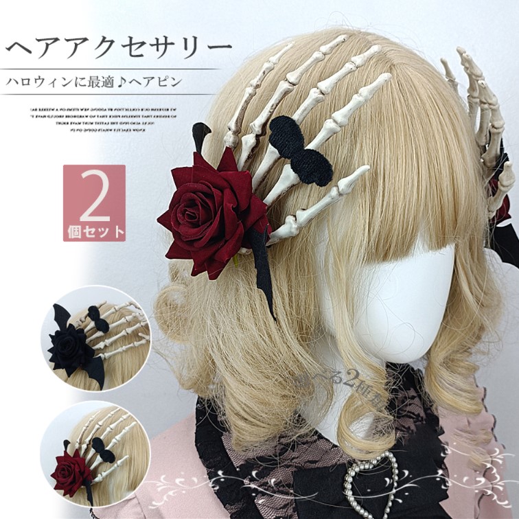 ゴージャスでクールなゴスロリ系 2個セット ハロウィン 髪飾り 骨 バラ レース コスプレ スケルトン 手 ヘアクリップ 骸骨 バラ付き ブローチ ヘアピン ヘアアクセサリー ヘア原宿系 面白い キモ
