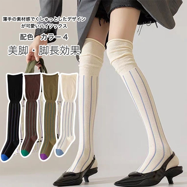 靴下 レディース ソックス くつ下 ハイソックス ニーハイソックス 薄手 綿混 くしゅくしゅ おしゃれ かわいい 履き心地良い 綿混 伸縮性 配色 美脚 脚長効果 カジュアル トレンド感 オールシーズ