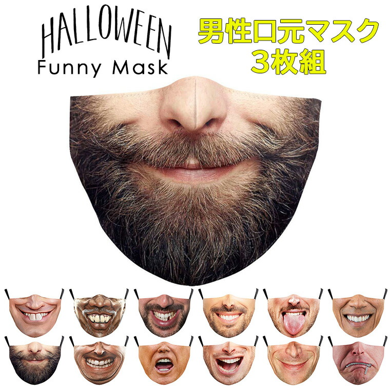 お茶目な男性のおもしろ口元マスク3枚組♪ マスク 面白い デザイン 口元マスク 男性 プリント おもしろ布マスク 3枚セット プリント あご紐調節可 洗濯可 大人用 ハロウィン