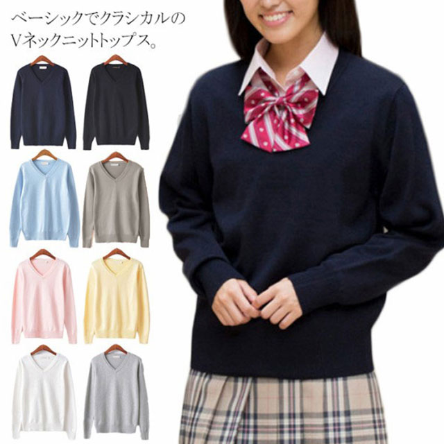 Vネック セーター ニットトップス スクールセーター 長袖 プルオーバー レディース 高校生 中学生 ニットソー 無地 長袖セーター 秋冬 カジュアル 通学 通勤 お出かけ 普段着