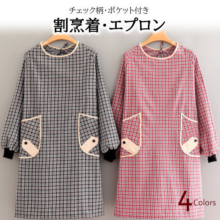 シンプルで使いやすい チェック柄 かっぽう着 長袖 エプロン 割烹着 袖付き ポケット付き 全4色