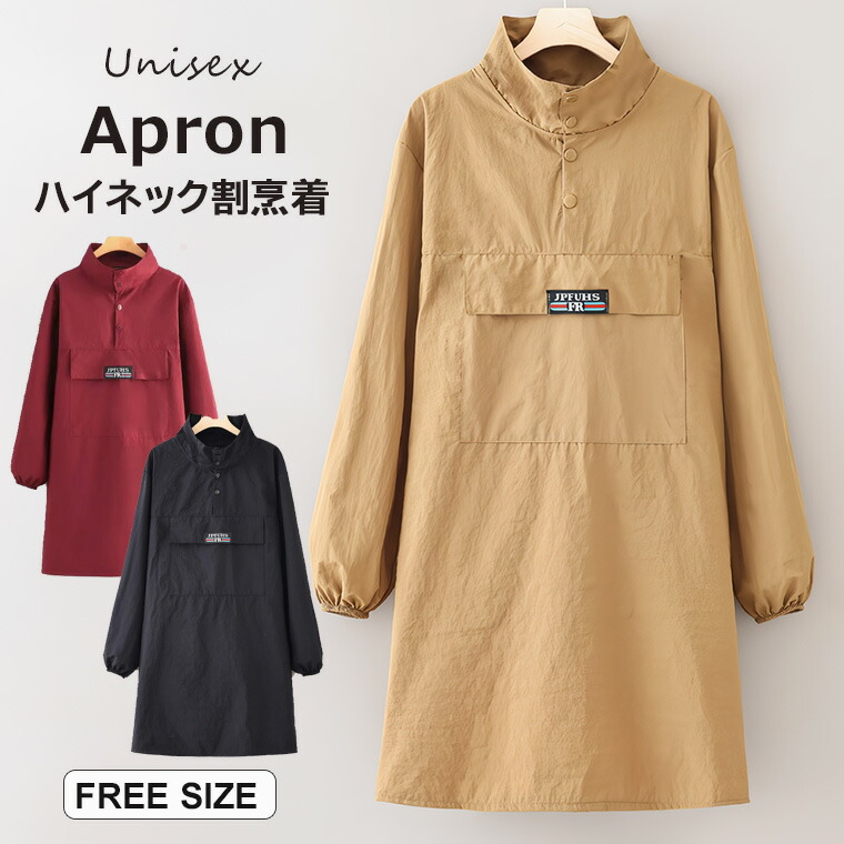 すっぽりと頭からかぶるだけの簡単着用 ♪3色展開 エプロン ハイネック 割烹着 袖あり 長袖 ポケット付 作業エプロン スモック オシャレ ゆったり フロントポケット 作業 農業 畑仕事 家庭菜園 作