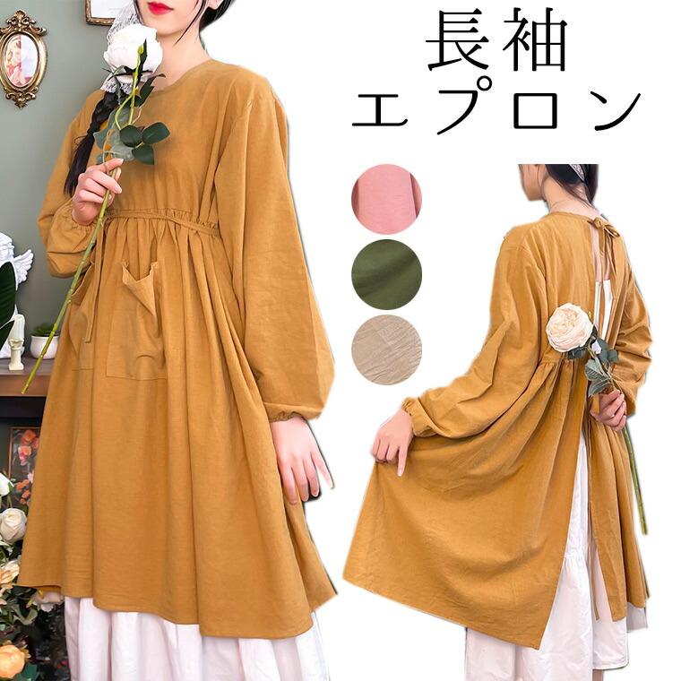 ワンピースのような長袖エプロン 割烹着 ン カフェエプロン 型 ボタン チュニックエプロン ワンピース ミドル かぶる ワークエプロン カフェエプロン 北欧風