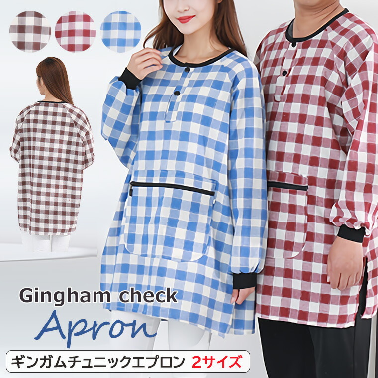 かっぽう着 2サイズ展開 エプロン ギンガムチェック 長袖 ユニセックス スモックエプロン おしゃれ レディース メンズ ジッパー付きポケット お料理 カフェ ガーデニング 全3色