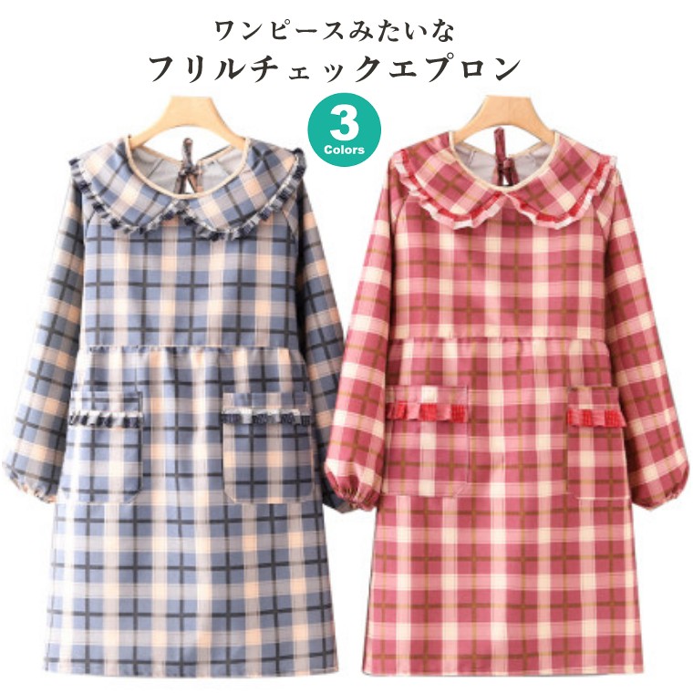 可愛いワンピースドレス風 長袖 チェック エプロン 襟付き フリルネック スモック ポケット付き かっぽう着 全3色