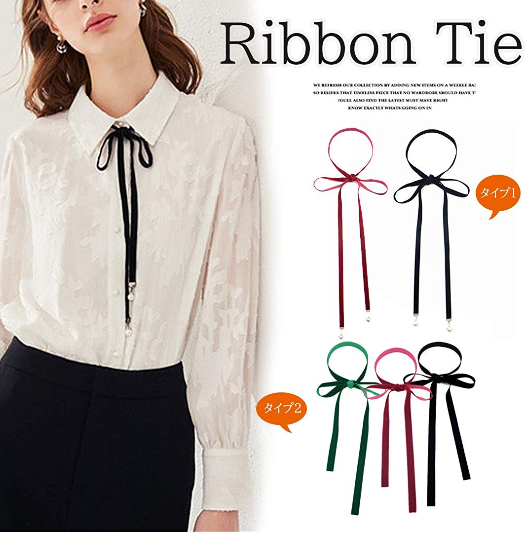 さりげなくおしゃれ 無地 リボンタイ レディース ベロア素材 ロング ボウタイ 蝶ネクタイ パール付き 結びタイプ