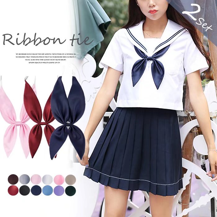 大人っぽさが演出する 選べる12色 2点セット スクールリボン 蝶結び セーラー服 無地 サテン 女子 通学 学生 制服小物 セーラー服 学生服 学園祭 コスプレ 衣装 アクセサリー コスチューム