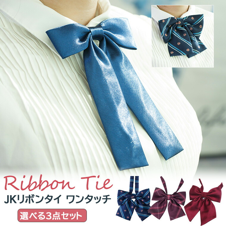 選べる3点セット リボンタイ ワンタッチ チェック柄 ストラップ スクールリボン 蝶ネクタイ 制服小物 ネクタイ 無地 制服リボン 中学生 高校生 仮装 コスプレ