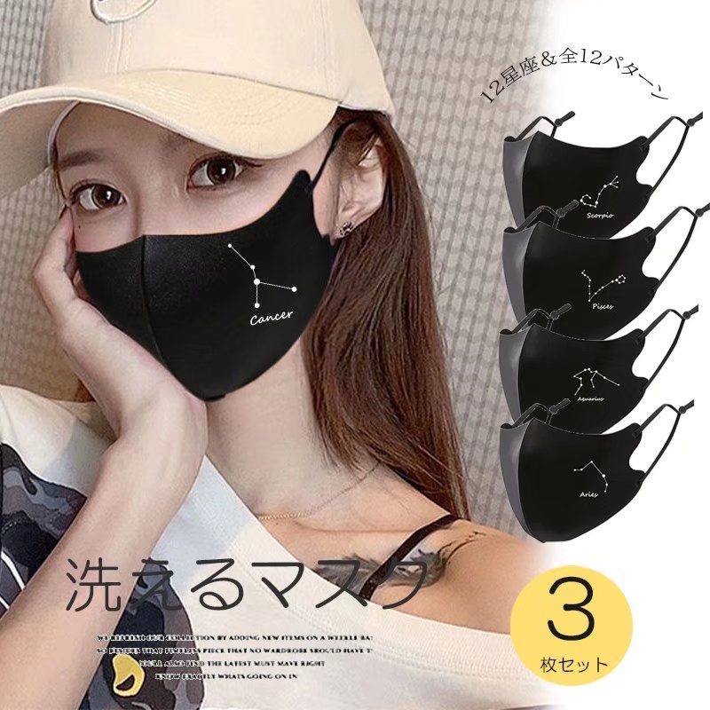 ちょっと特別な自分だけの星座デザイン 全12星座 3枚セット ペアルック 布マスク 星座プリント ブラック マスク オシャレ ファッションマスク UVカット 星