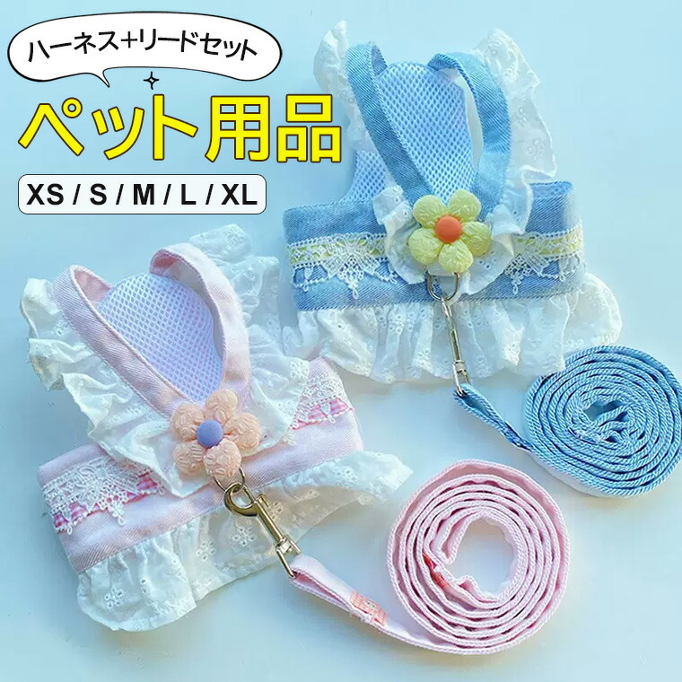 可愛いお散歩セット ♪ペット用 ハーネス ハーネスドレス リード付き ペット用品 ベスト ハーネスリード レース切替 デニム風 子犬 レースドレス 小型犬 中型犬 牽引ロープセット