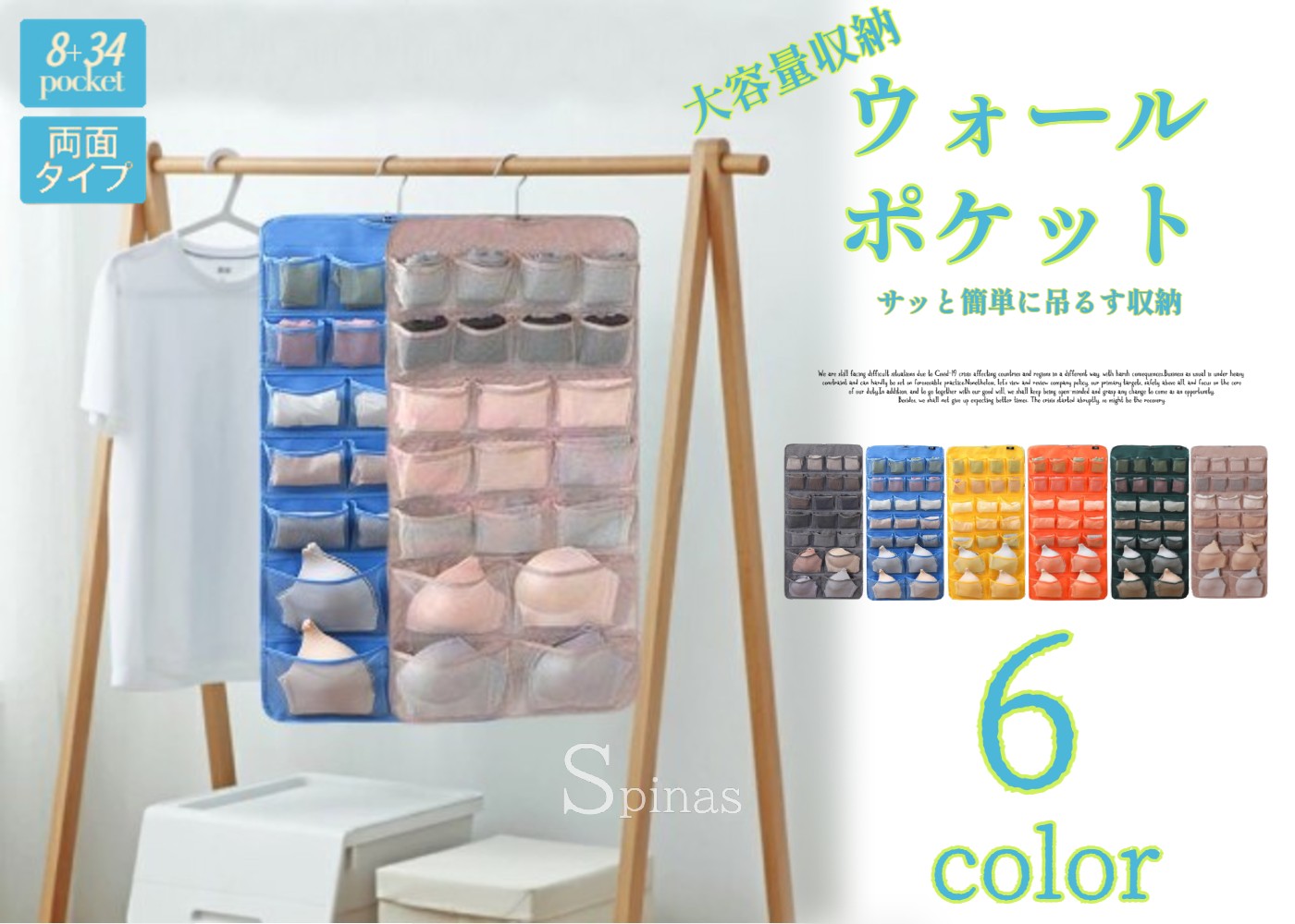 どこでも吊るせて大容量収納 出し入れ簡単 下着収納 吊り下げ収納 ハンガー 収納ポケット 両面収納 メッシュ 壁掛け収納 ウォールポケット 42ポケット クローゼット 全6色