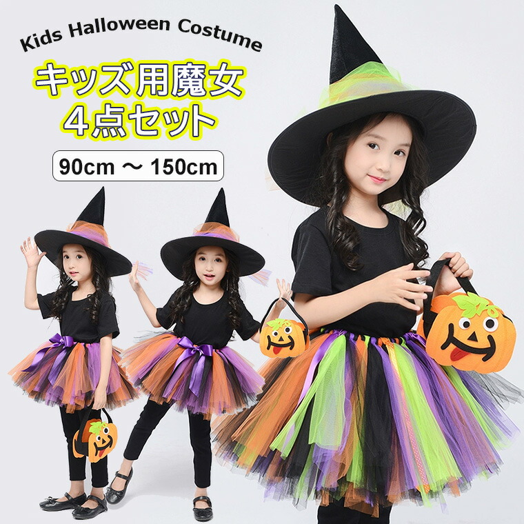 ハロウィン 衣装 女の子 魔女 4点セット コスプレ コスチューム シャツ カラフル チュチュスカート 帽子 南瓜袋 子供 キッズ 変装 仮装 演出 発表会 イベ