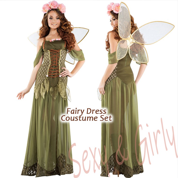 フェアリー 妖精 ハロウィン コスプレ エルフ 仮装 羽 花 ワンピース ドレス コスチューム グリーン 3点セット