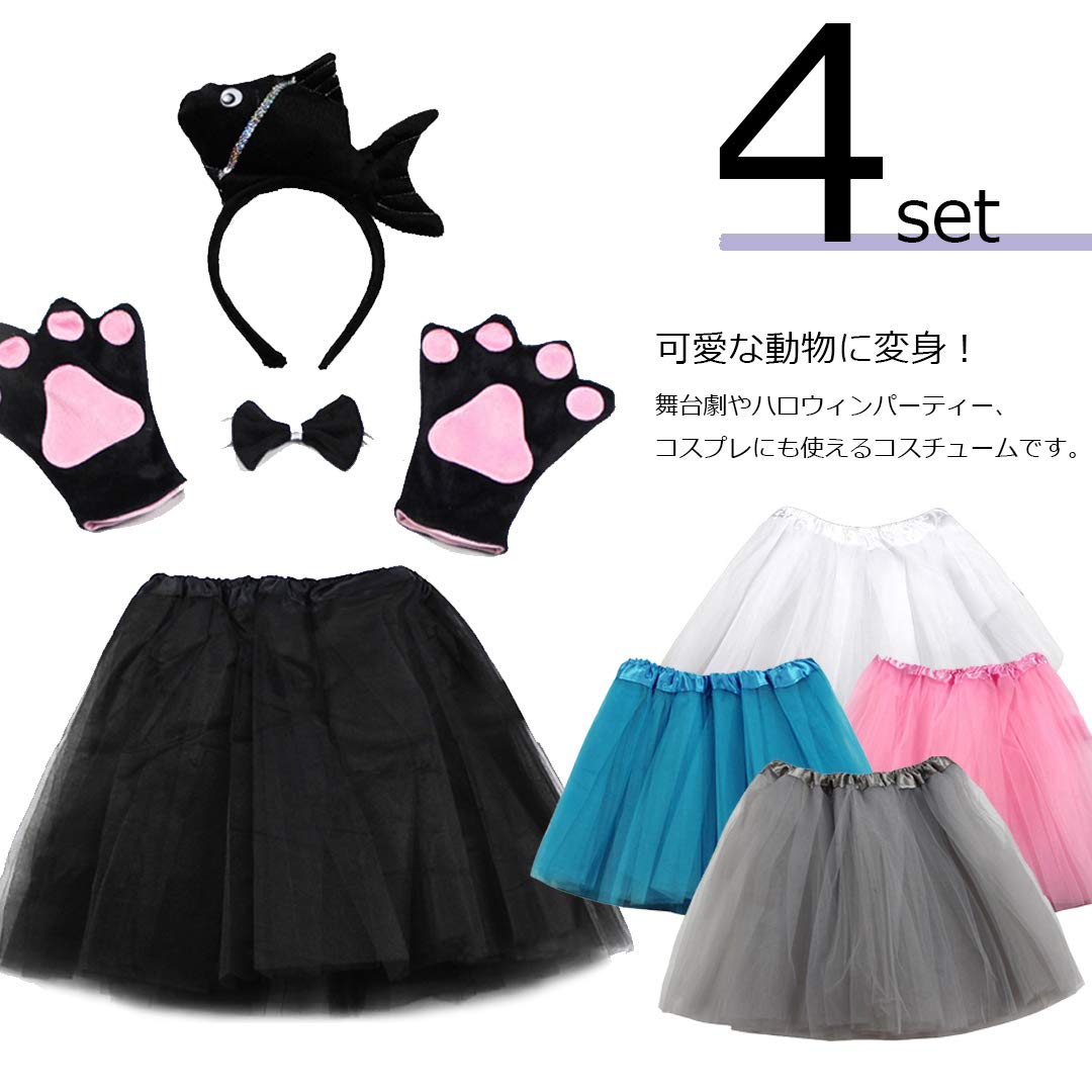 キッズ ハロウィーン コスプレ 仮装 4点セット カチューシャ リボンネクタイ 肉球手袋, チュールスカート 全5色