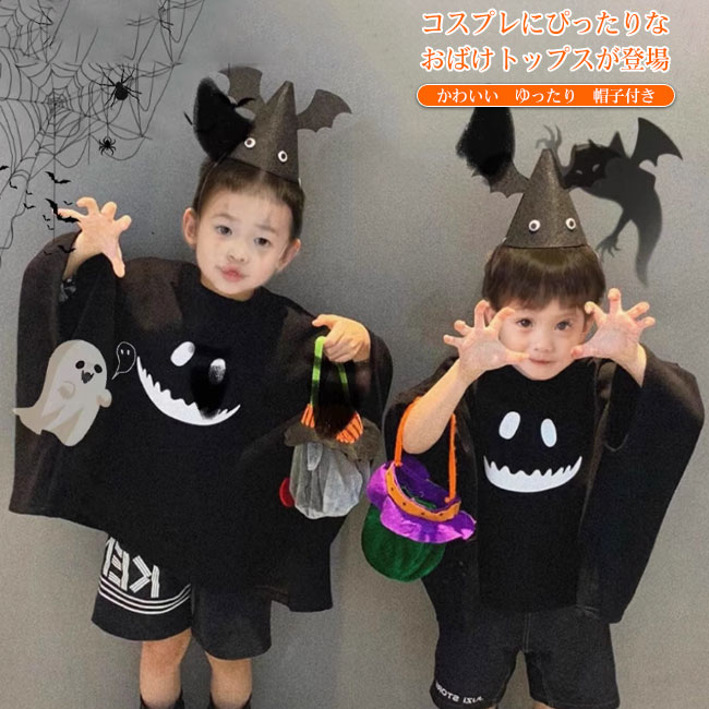 ハロウィン キッズ 子供 衣装 仮装 コスプレ Tシャツ おばけ 幽霊 ポンチョ風 帽子付き 可愛い ゆったり 男の子 女の子 男女兼用 ユニセックス 肌触り良い キュート イベント パーティー お出