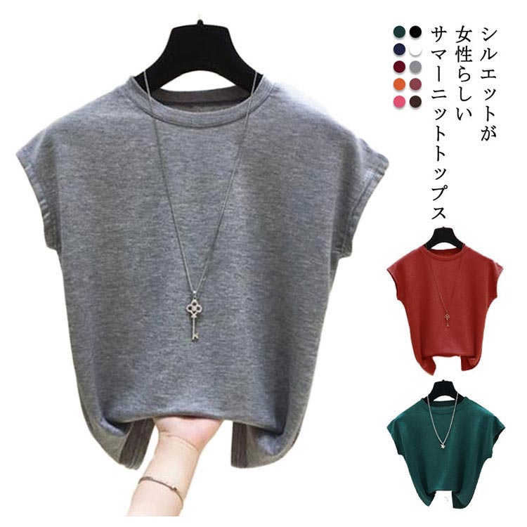 ノースリーブ ニットTシャツ レディース サマーニット トップス プルーオーバー フレンチスリーブ 無地 薄手 クルーネック S M L XL 2XL 3XL 4XL 5XL